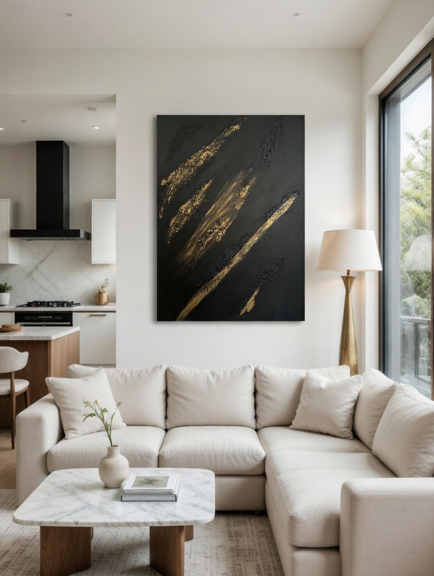A texturált, erőteljes aranyszínű vonalak mozgást és fényt visznek a térbe, miközben a sötét háttér luxus és kifinomultság érzetét kelti. Keret nélkül elhelyezve különösen letisztult és kortárs megjelenésű, tökéletes választás azoknak, akik egy drámai, mégis harmonikus fókuszpontot szeretnének a nappalijukba.